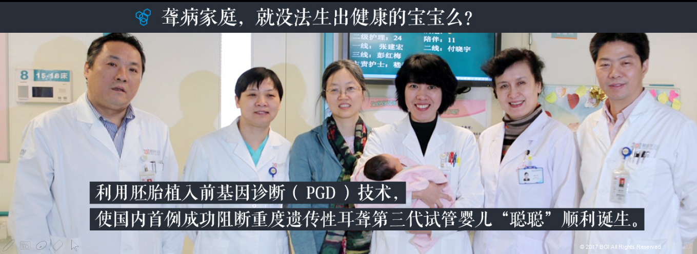 很多人会问,一个耳聋病家庭,就没办法生出一个健康的宝宝吗?刚才我们谈到的无创产前基因检测是检查,那有没有可能检查出来之后去干预?当然有可能。即使父母双方都是失聪的,我们依然可以通过三代试管婴儿技术,通过胚胎植入前基因诊断(PGD)技术植入胚胎,生出一个双耳听力正常的宝宝。